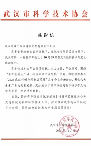 ? ? 在年會上,武漢市政院展示了近年來在科技創(chuàng)新和科學(xué)普及方面取得的成果,贏得了武漢市科協(xié)的高度贊譽,特此發(fā)來感謝信,對雙方在科技領(lǐng)域的攜手合作予以充分肯定,并期待未來繼續(xù)并肩前行,共同書寫科技進(jìn)步與城市發(fā)展的新篇章。