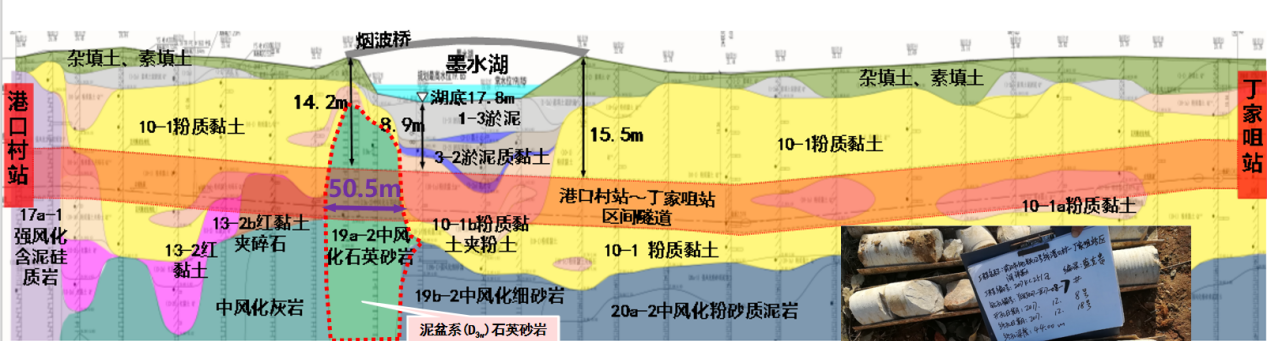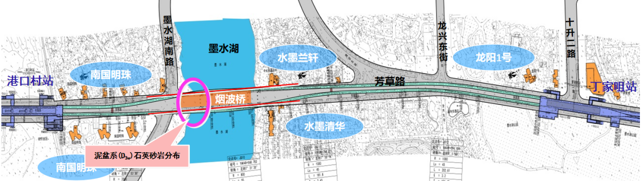 ? ? 超硬巖層、超近下穿。本項(xiàng)目設(shè)計(jì)范圍中的港口村站~丁家咀站區(qū)間隧道長約1242m,采用盾構(gòu)法施工,管片直徑6.2m,需下穿墨水湖與煙波橋,該巖層號稱“磨刀石”,為武漢地鐵建設(shè)史上的最硬巖層。