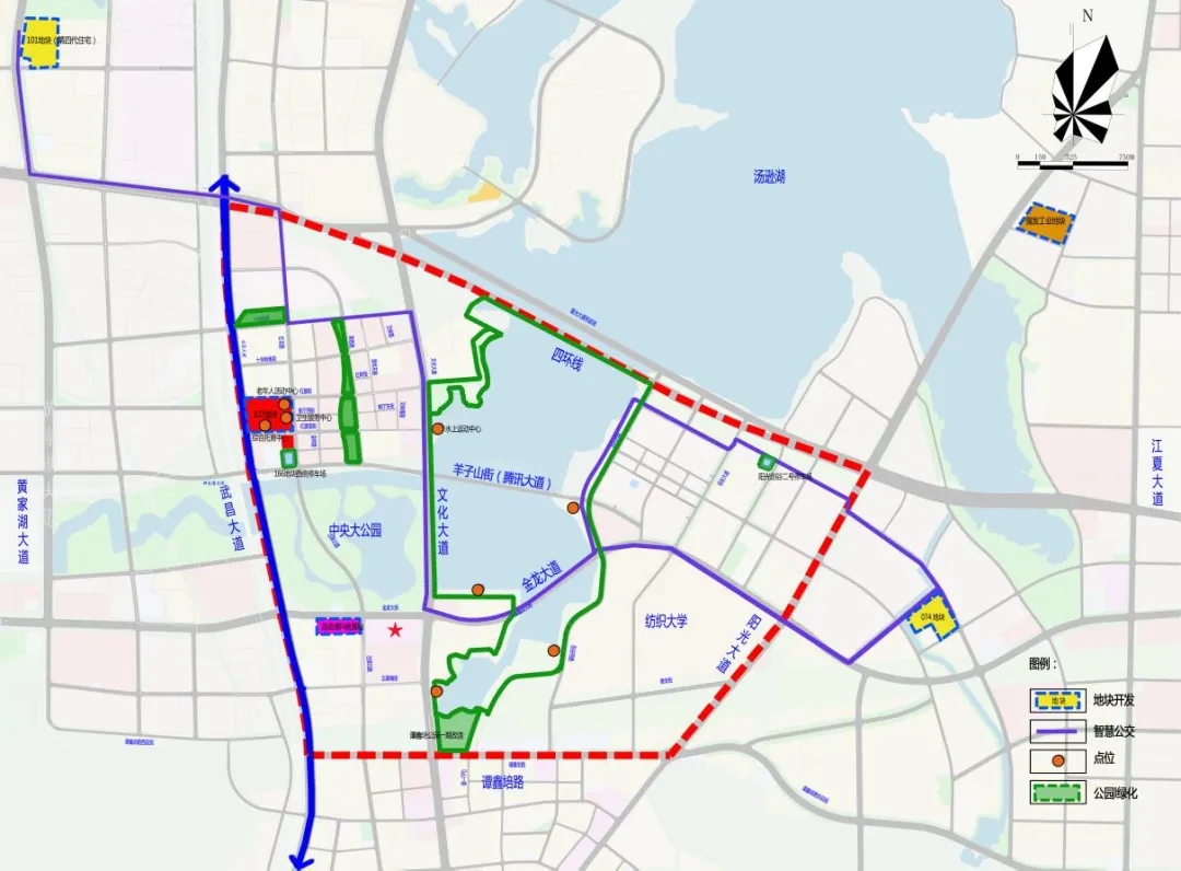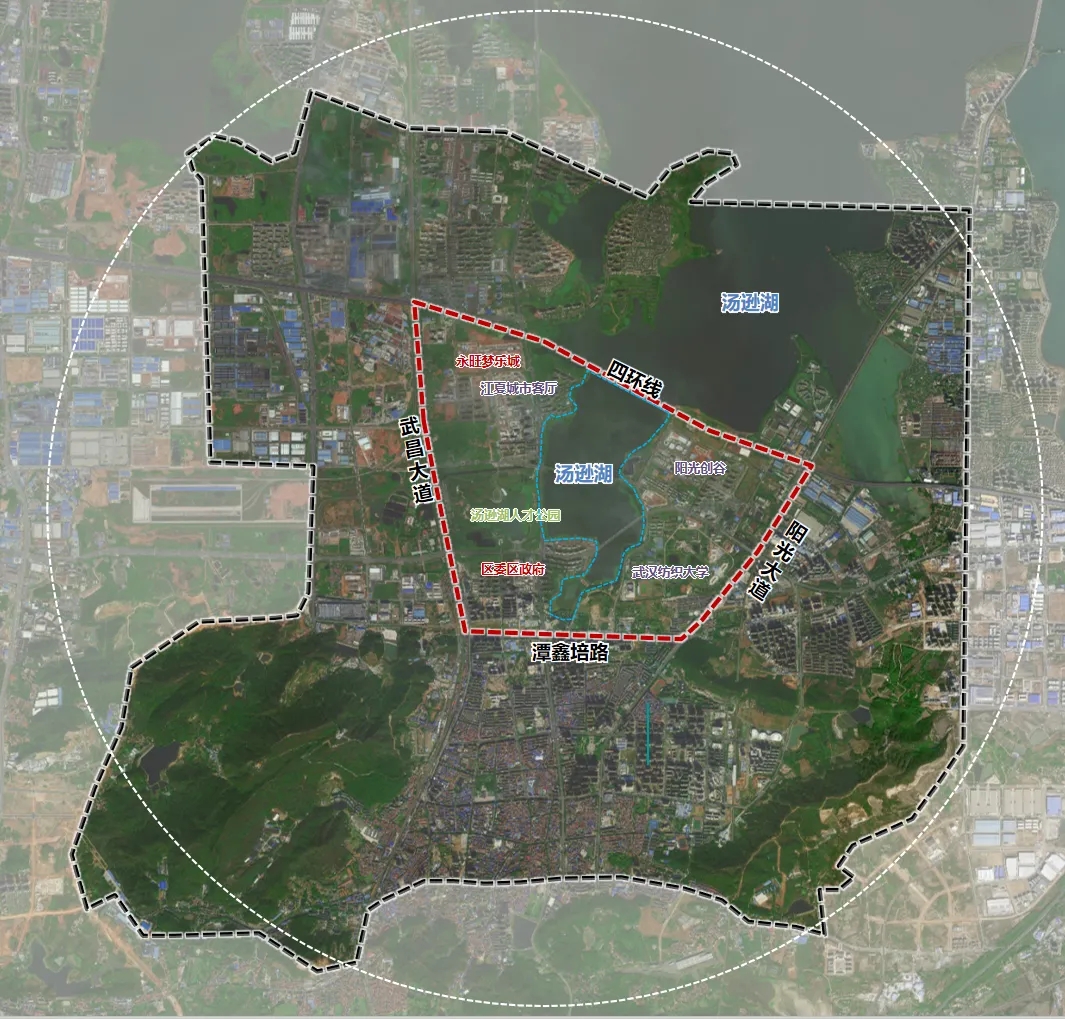 項目核心區(qū)范圍北起四環(huán)線,南抵譚鑫培路,西至武昌大道,東達陽光大道,規(guī)劃區(qū)域面積10.65㎞²(含水域2.2㎞²),研究范圍更延伸至區(qū)界、廟山大道、紙坊大街、黃家湖大道及區(qū)界圍合形成的廣闊區(qū)域。