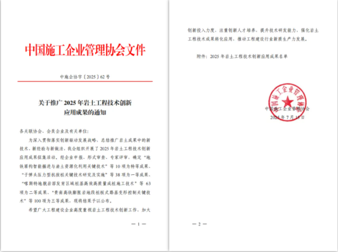 ? ? 近日,中國施工企業(yè)管理協(xié)會2025年巖土工程技術(shù)創(chuàng)新應用成果結(jié)果正式揭曉。經(jīng)過企業(yè)申報、形式審查、專家評審等多個環(huán)節(jié)遴選,武漢市政院巖土博士創(chuàng)新工作室申報的“深厚富水圓礫層基坑地下水控制特種技術(shù)”、“敏感環(huán)境地鐵盾構(gòu)隧道穿越極硬巖特種技術(shù)”等2項技術(shù)創(chuàng)新性顯著,獲評為三等成果。
