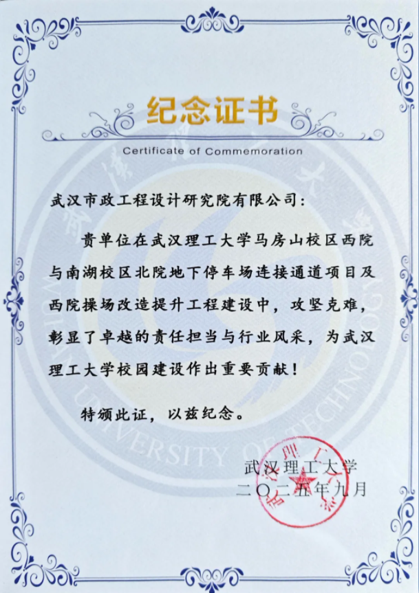 2025年9月6日上午,由武漢市政院設(shè)計(jì)的武漢理工大學(xué)馬房山校區(qū)西院與南湖校區(qū)北院地下停車場連接通道項(xiàng)目(以下簡稱“武漢理工大學(xué)地下通道”)通車儀式隆重舉行。洪山區(qū)區(qū)委區(qū)政府主要領(lǐng)導(dǎo)、武漢理工大學(xué)領(lǐng)導(dǎo)及各參建單位代表共同出席,見證這一重要時(shí)刻。儀式上,洪山區(qū)區(qū)委主要領(lǐng)導(dǎo)頒發(fā)“紀(jì)念證書”,表彰武漢市政院等參建單位在項(xiàng)目設(shè)計(jì)與實(shí)施過程中作出的重要貢獻(xiàn)。