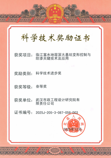 近日,2025年度湖北省科學技術(shù)獎獲獎名單正式公布。由武漢市政院深度參與研發(fā)的科研項目“臨江富水地層深大基坑變形控制與防滲關(guān)鍵技術(shù)及應用”,憑借顯著的技術(shù)創(chuàng)新性與突出的工程應用價值,榮獲湖北省科學技術(shù)進步三等獎。