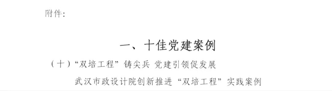 ? ? 近日,武漢市市政行業(yè)協(xié)會(huì)發(fā)布《2025年度武漢市市政行業(yè)黨建案例評(píng)選結(jié)果》,武漢市政院申報(bào)的創(chuàng)新實(shí)踐案例——《“雙培工程”鑄尖兵,黨建引領(lǐng)促發(fā)展》入選“十佳黨建案例”。