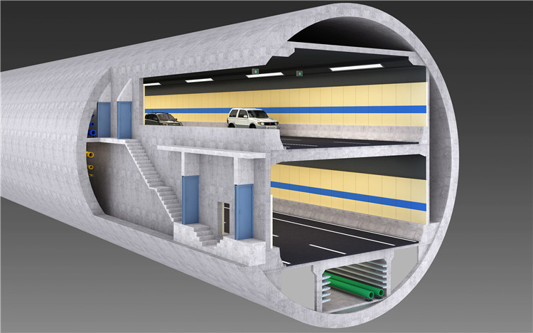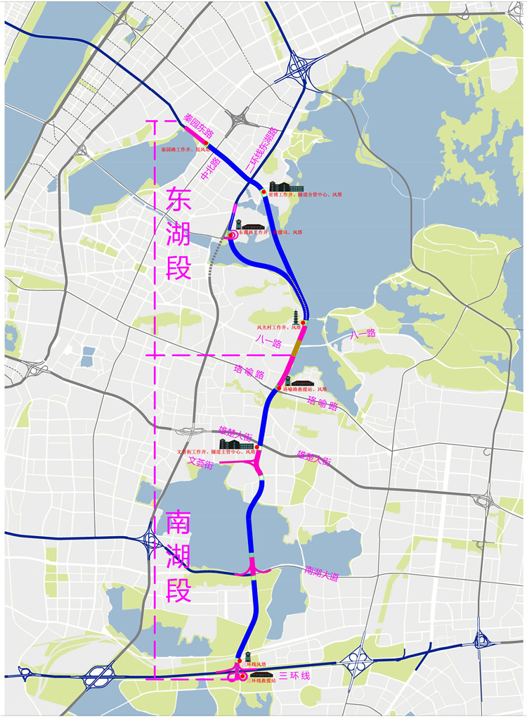 兩湖隧道工程北接秦園路和東湖路,南連三環(huán)線,分為東湖段、南湖段,全長約19公里。兩湖隧道采用“隧-路-隧”的總體建設方式,隧道內設計為上、下兩層,分別行駛不同方向的車輛,節(jié)約了用地、減少拆遷成本。南湖段盾構直徑為15.5米,超大直徑設計居國內之首,是國內最長、世界規(guī)模最大的城市湖底雙層隧道。