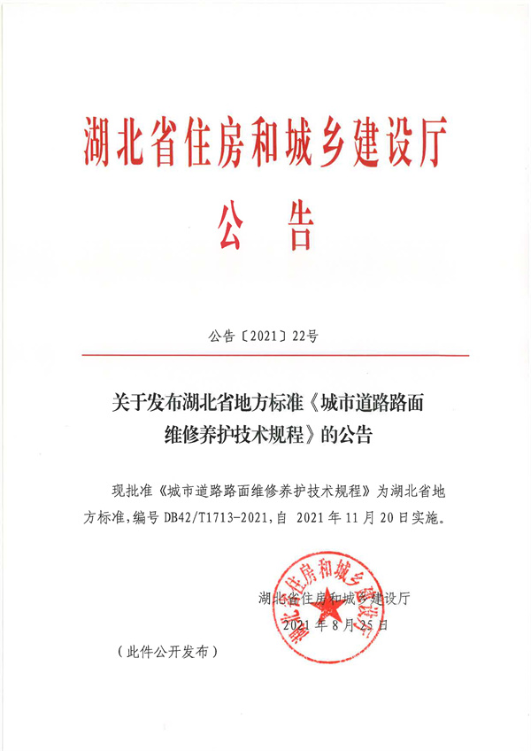 由我公司牽頭起草的湖北省地方標準《城市道路路面維修養(yǎng)護技術(shù)規(guī)程》(編號:DB42/T 1713-2021)于2021年7月20日由湖北省住房和城鄉(xiāng)建設(shè)廳、湖北省市場監(jiān)督管理局聯(lián)合發(fā)布,并于2021年11月20日起實施。