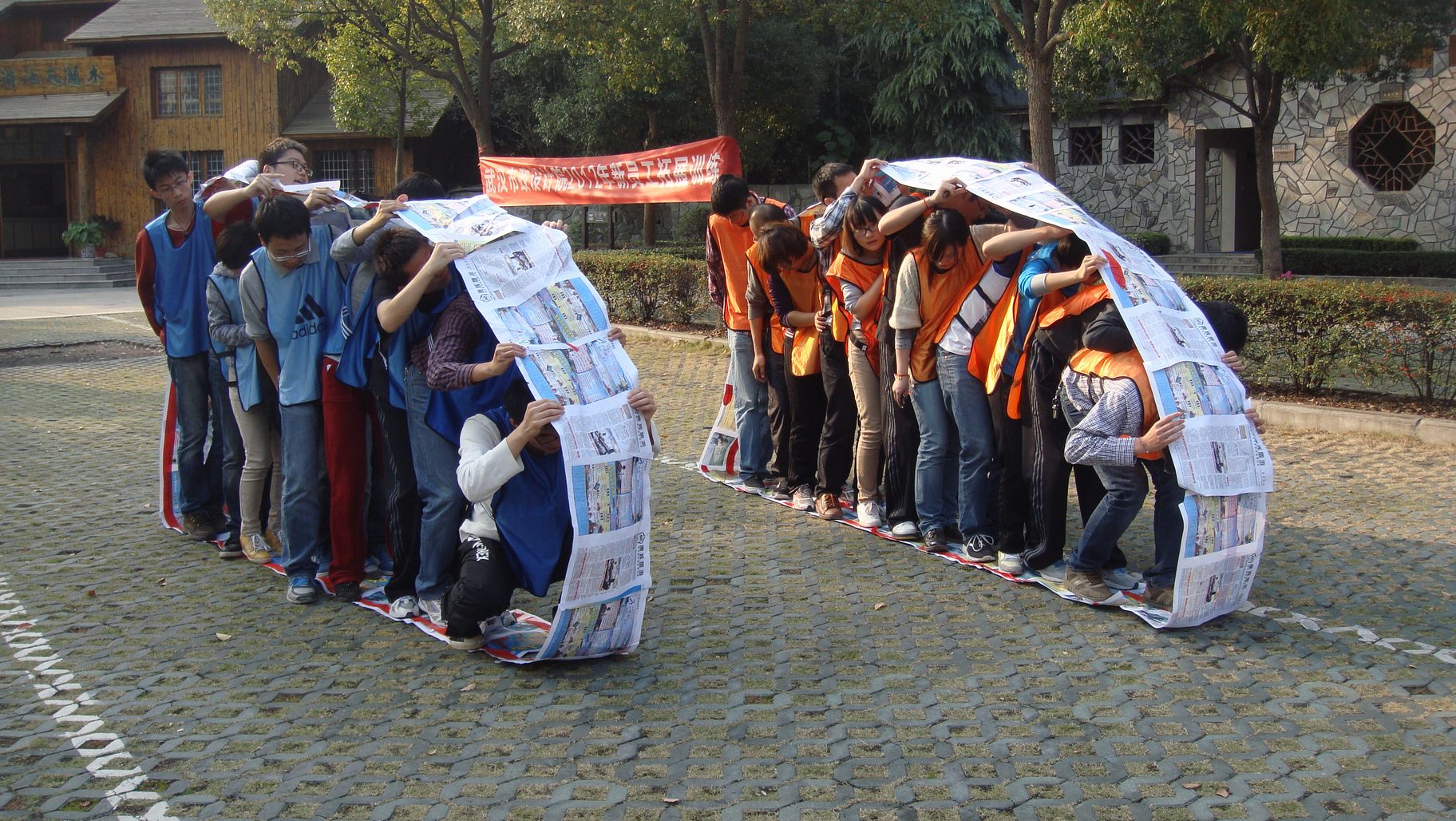 ??? 當(dāng)天下午,在進(jìn)行簡單破冰之后,新員工分成兩隊(duì)進(jìn)行團(tuán)隊(duì)項(xiàng)目活動(dòng),兩隊(duì)隊(duì)員團(tuán)結(jié)一心,各獻(xiàn)奇計(jì),制作出本隊(duì)的隊(duì)旗,選定了本隊(duì)的口號(hào)和對(duì)歌,為團(tuán)隊(duì)項(xiàng)目的開展打好了基礎(chǔ)。在“履帶戰(zhàn)車”這個(gè)項(xiàng)目中,兩隊(duì)隊(duì)員開動(dòng)腦筋,利用報(bào)紙和膠帶拼接成了滾動(dòng)的履帶,隊(duì)員們統(tǒng)一協(xié)作,在有節(jié)奏的口號(hào)聲中推動(dòng)“履帶”前行,體驗(yàn)到了“統(tǒng)一聯(lián)動(dòng)”和“萬眾一心”在團(tuán)隊(duì)中的重要作用。
