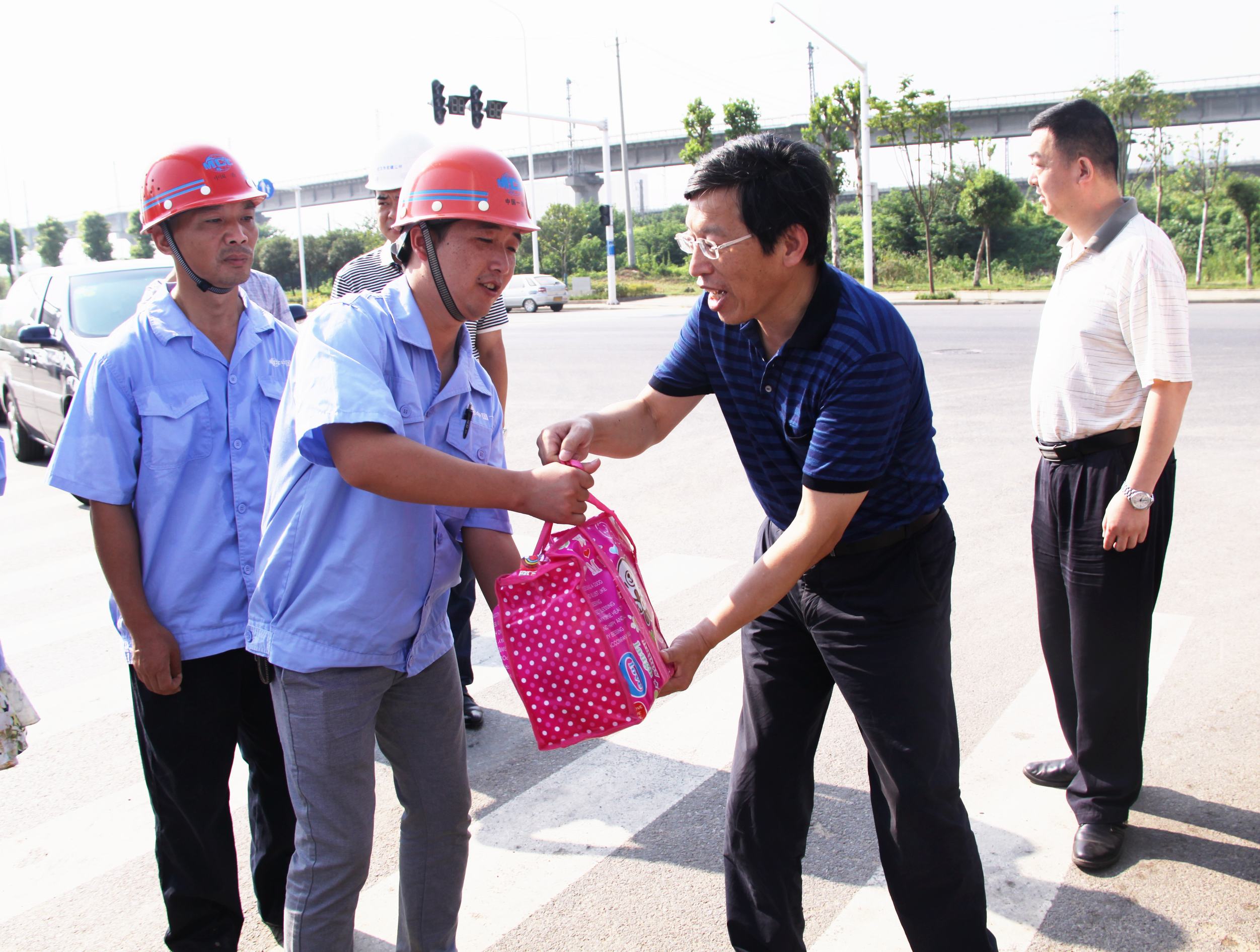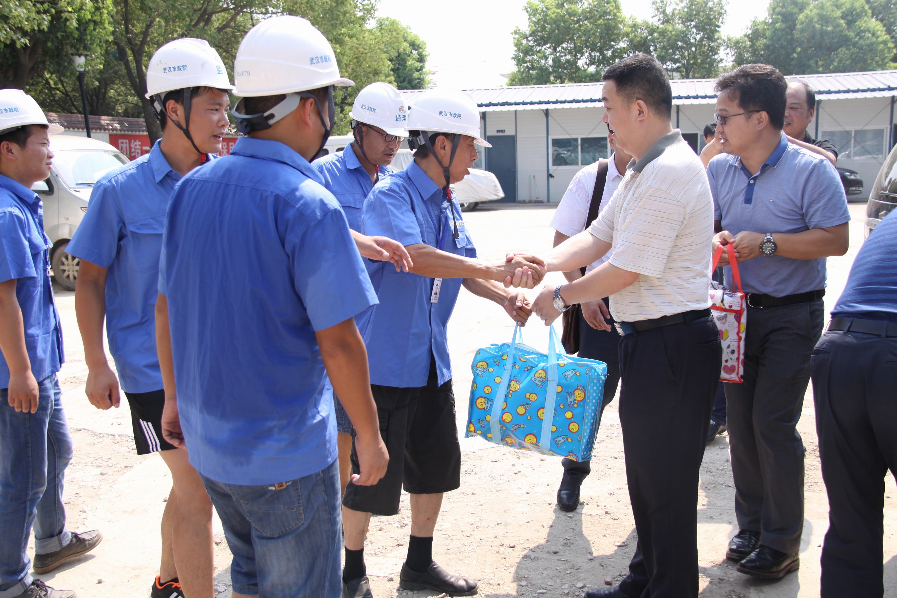 ??? 蔡輝書記一行先后來到城華路、漢陽海綿城市示范區(qū)、黃家湖污水處理廠等工地現(xiàn)場,為堅守在現(xiàn)場的員工們送上消暑慰問品。公司領(lǐng)導聽取了現(xiàn)場負責人的工作情況匯報,詳細詢問了員工們的工作和生活情況,并叮囑他們注意高溫天氣下的工作安全。同時要求相關(guān)部門負責人合理安排工作時間,做好人員調(diào)配,制定防暑降溫工作預案,保證一線員工的身體健康。