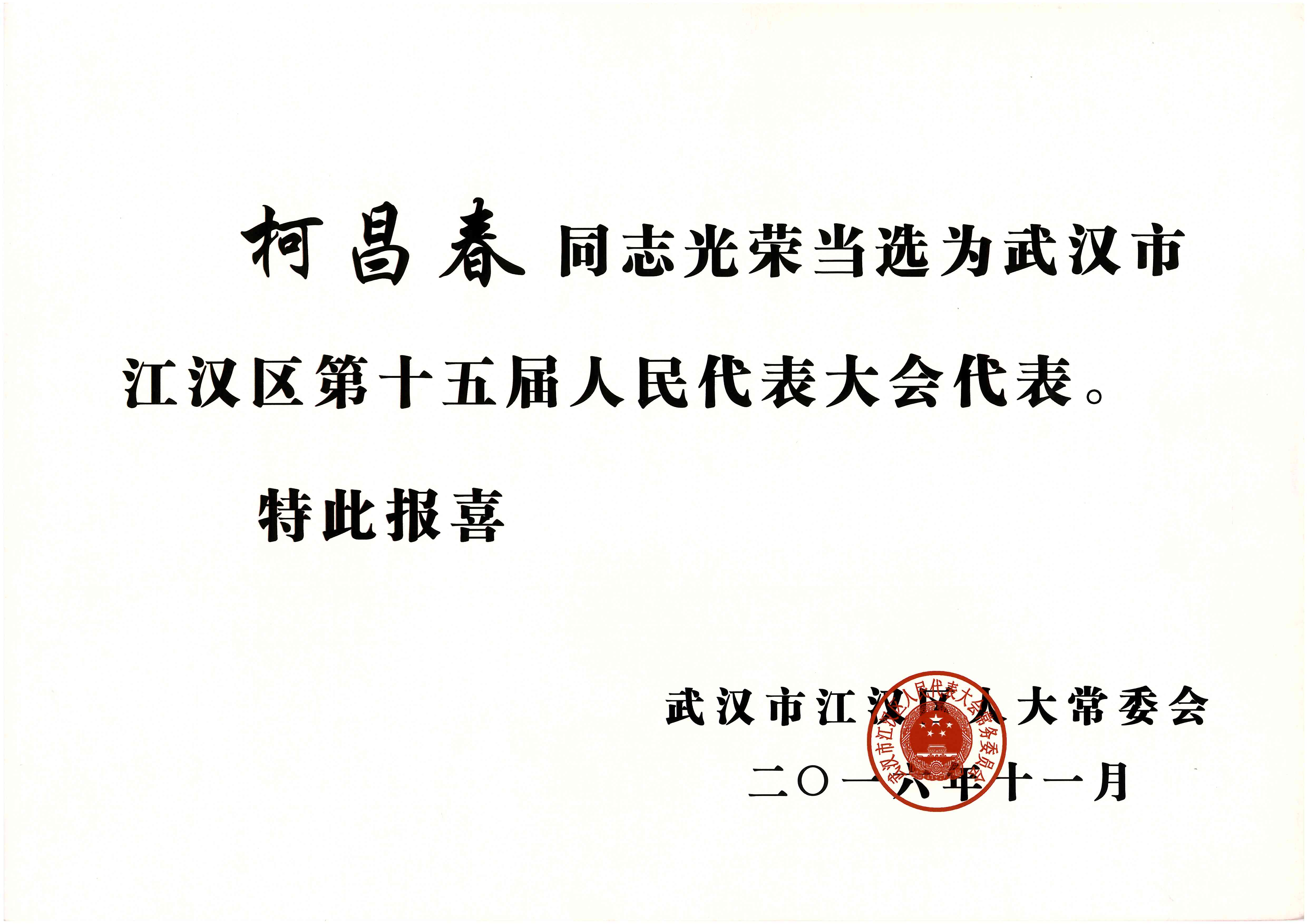 ??? 11月10日,江漢區(qū)進(jìn)行了人大代表選舉,依法選舉產(chǎn)生了第十五屆人民代表大會(huì)代表,后經(jīng)江漢區(qū)人大常委會(huì)確認(rèn),公司董事長(zhǎng)柯昌春同志光榮當(dāng)選為江漢區(qū)第十五屆人民代表大會(huì)代表。這也是他連續(xù)第二次當(dāng)選為江漢區(qū)人大代表。