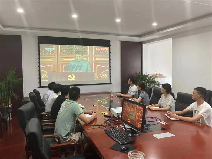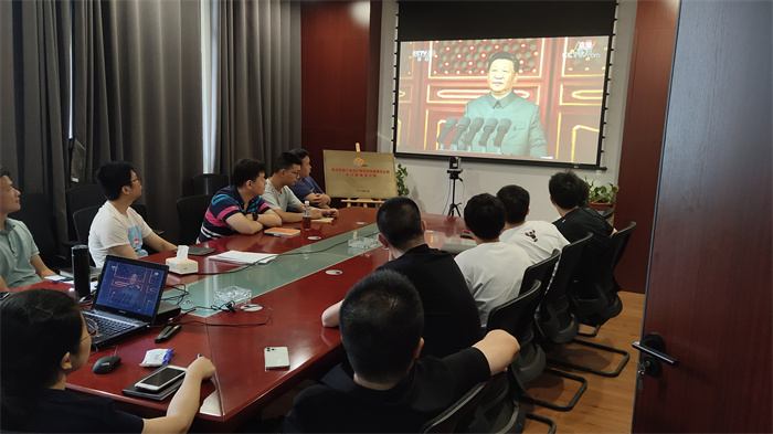 公司領(lǐng)導(dǎo)、總經(jīng)理助理、駐總院辦公的部門負(fù)責(zé)人、支部書記在西四樓會(huì)議室集中收看大會(huì)盛況。大會(huì)伊始,在轟鳴的禮炮聲中,國(guó)旗護(hù)衛(wèi)隊(duì)護(hù)衛(wèi)國(guó)旗颯爽登場(chǎng);全場(chǎng)肅立高唱《國(guó)歌》,高亢的旋律瞬間營(yíng)造了莊嚴(yán)肅穆的氛圍;少先隊(duì)員和共青團(tuán)聯(lián)合獻(xiàn)詞,回顧黨的光輝歷史,表達(dá)對(duì)黨的熱愛(ài)與忠誠(chéng)。大會(huì)現(xiàn)場(chǎng)氣氛莊嚴(yán),激昂奮進(jìn),讓收看的人仿佛置身現(xiàn)場(chǎng),親臨盛典。
